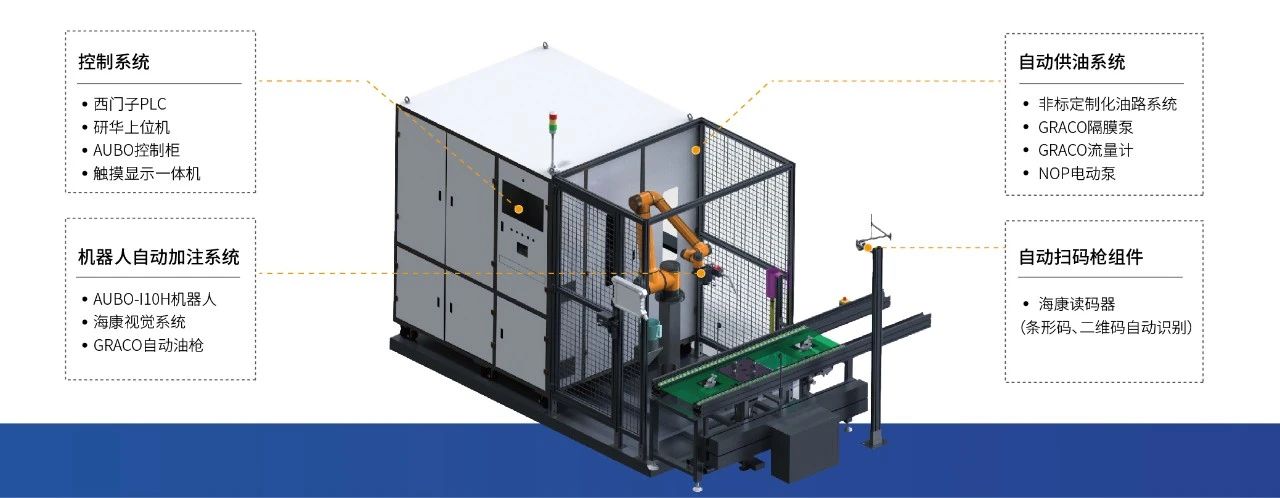 该系统主要由智能协作机器人、自动加油枪组件、视觉系统、读码器系统、自动供油系统、PLC系统控制部分、上位机系统等组成,可实现自动扫描识别生产机型并精准定位注油孔位、注油量精准控制、注油数据实时交互、24小时连续自动加注机油等。