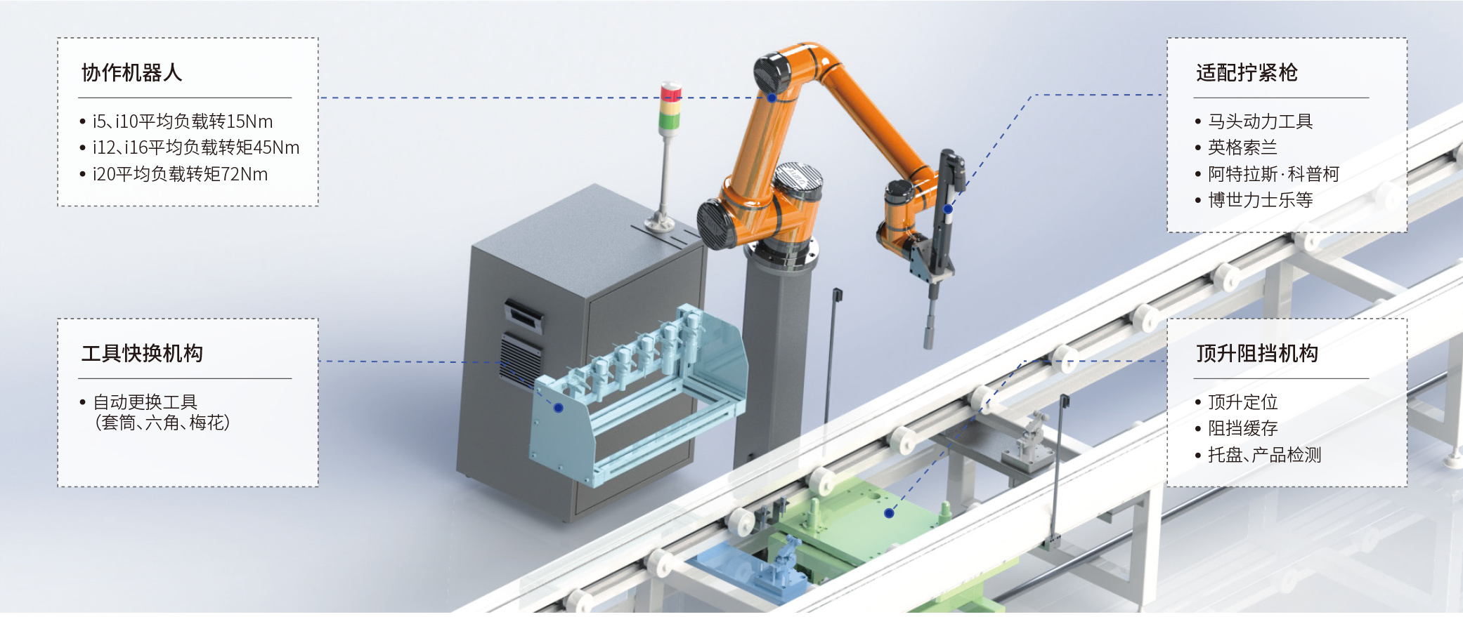 该系统主要由智能协作机器人、适配拧紧枪、工具快换机构和顶升阻挡机构组成,可实现螺栓和螺母抓取、螺栓孔识别和定位、螺栓紧固,从初级拧紧到最终拧紧、检查等一系列工序的自动化。