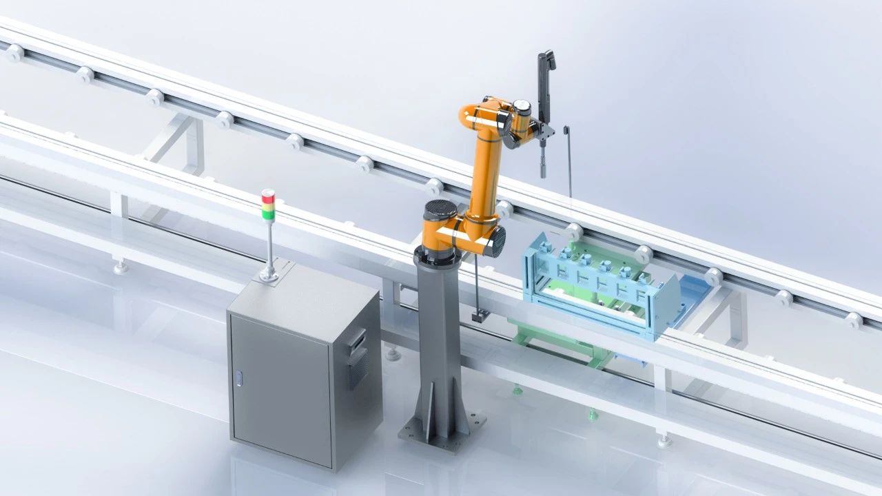 机器人自动拧紧系统主要由智能协作机器人、适配拧紧枪、工具快换机构和顶升阻挡机构组成,可实现螺栓和螺母抓取、螺栓孔识别和定位、螺栓紧固,从初级拧紧到最终拧紧、检查等一系列工序的自动化。