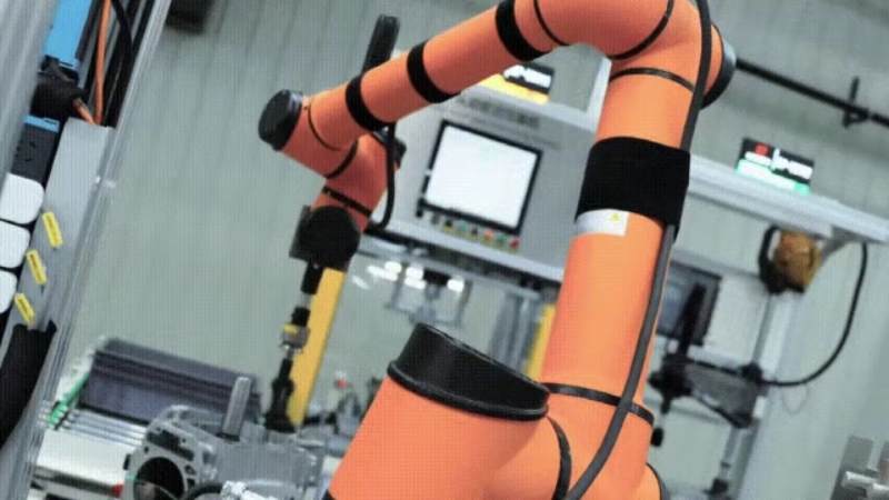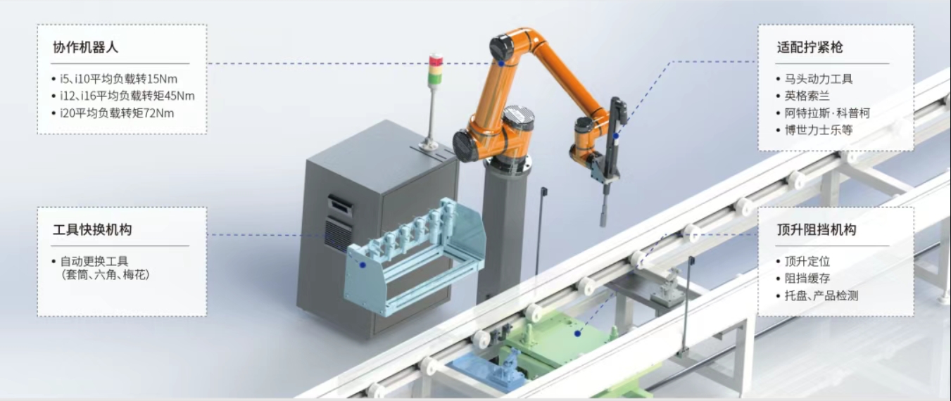 该机器人自动拧紧系统凭借协作机器人高精确度、高稳定性、高柔性化的优势,可以实现发动机装配拧紧过程中的螺栓螺孔自动识别适配、拧紧扭矩自适应调节、自动快速更换套筒等,有效替代人工,实现全流程自动化。同时因其小巧灵活易部署的特性,更高度契合装配车间狭小空间作业的需求。